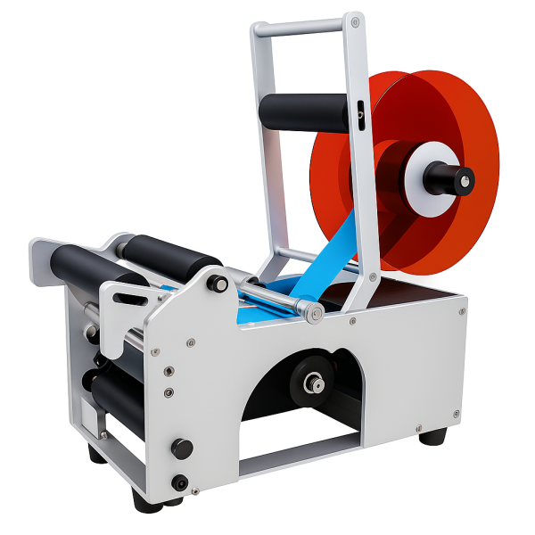 Semi-automatic labelling machine for round bottles with up to 20 labels per minute, offering precise wrap-around labelling and optional batch coding or inkjet printing integration.